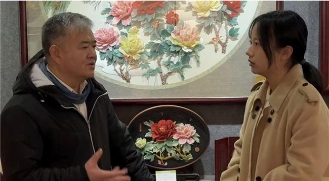 2月5日,电子2502班刘歆睿走进山西长治堆锦博物馆,与“立体国画”传承人闫向军展开对话。闫向军向刘歆睿细致讲解这项技艺的独特之处——以丝绸锦缎层层堆叠出浮雕效果,将吉祥寓意融入绚丽丰富的层次之中。